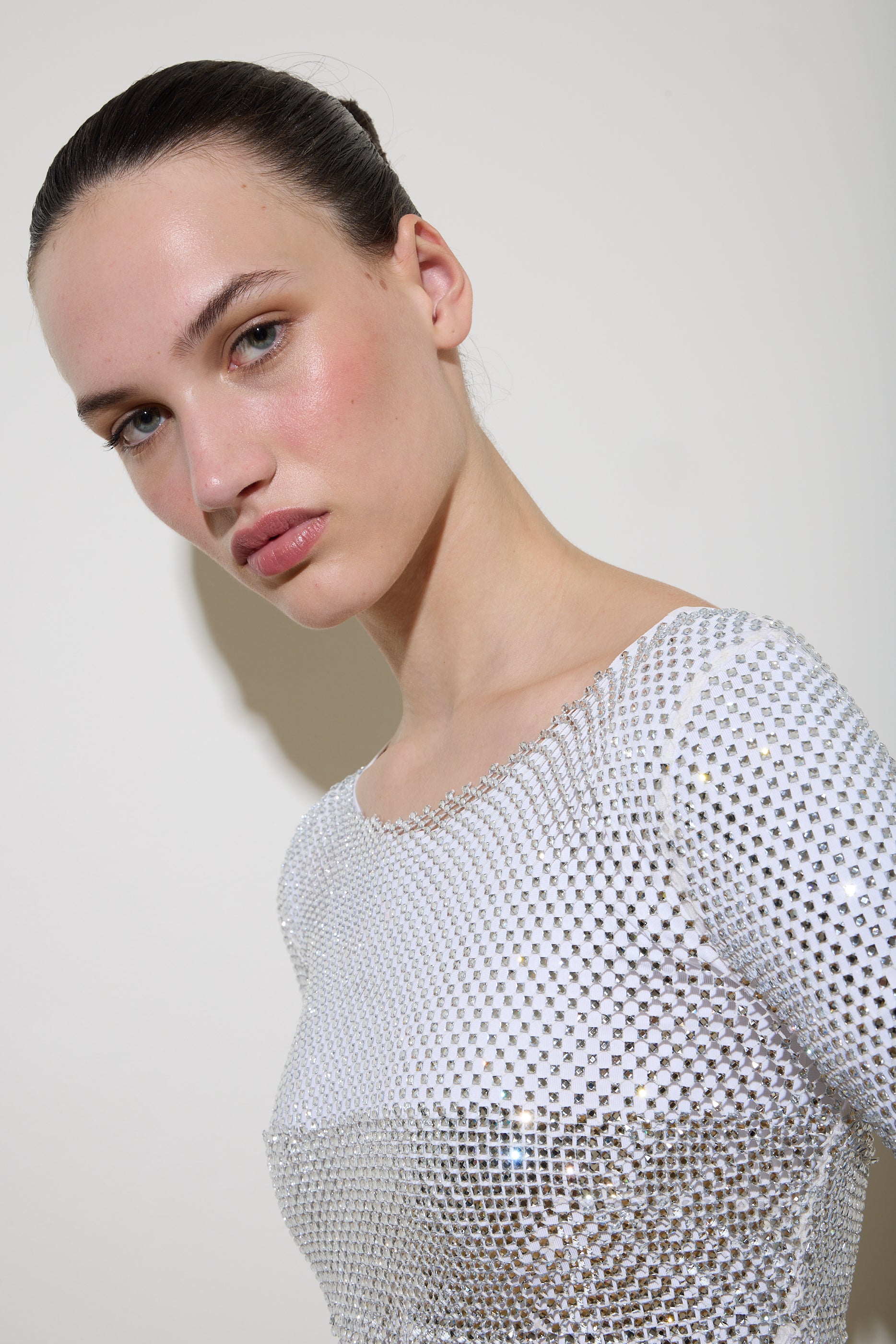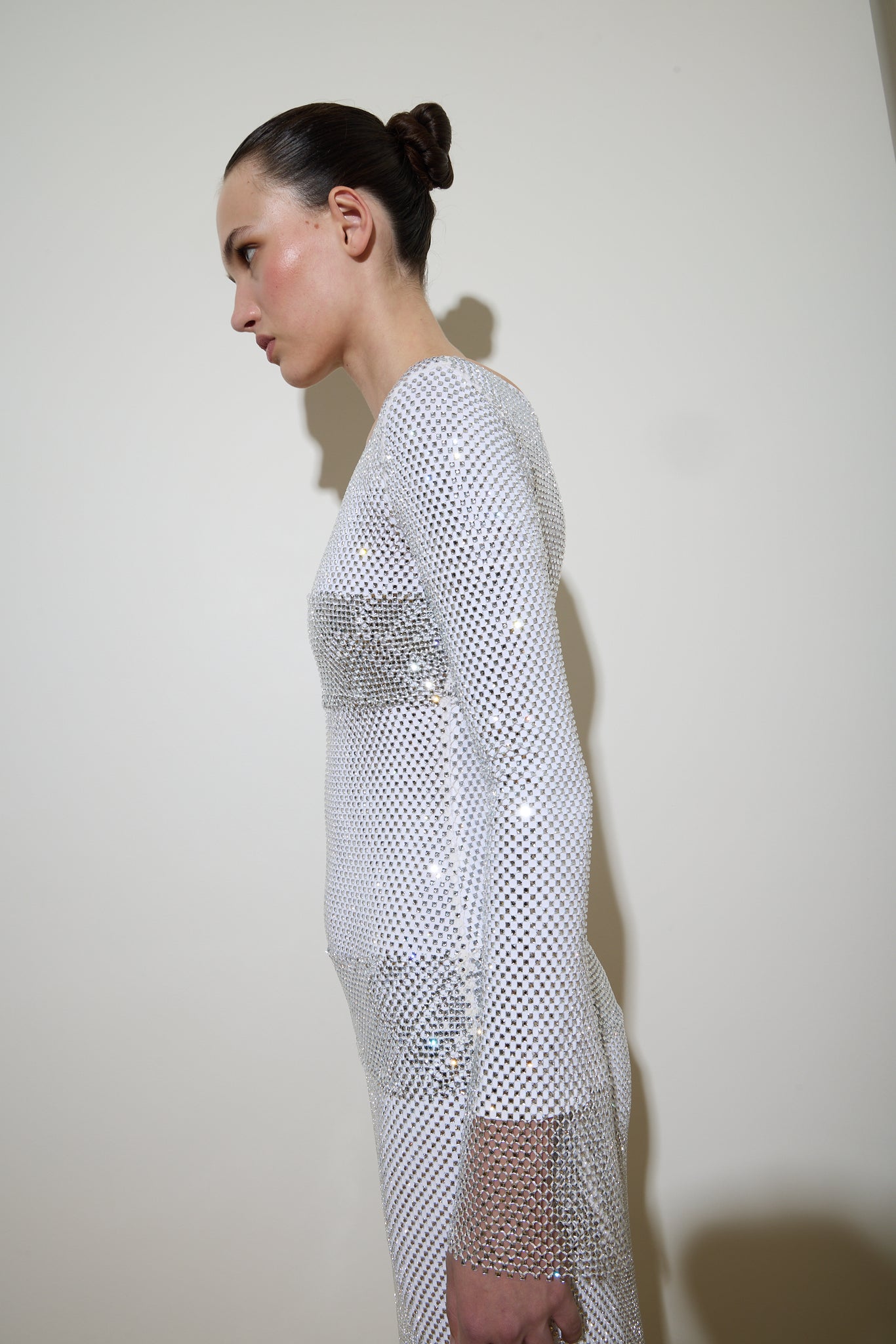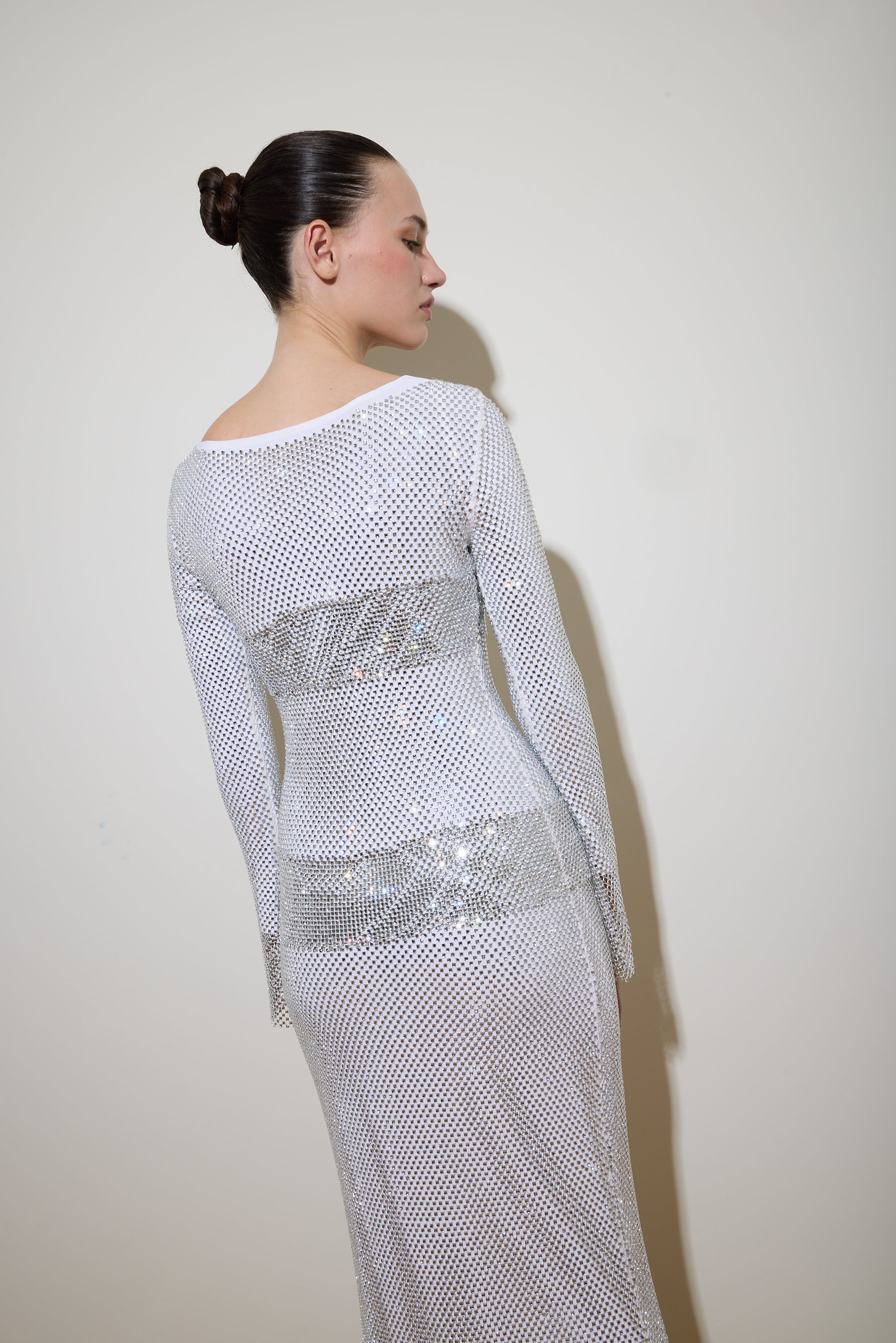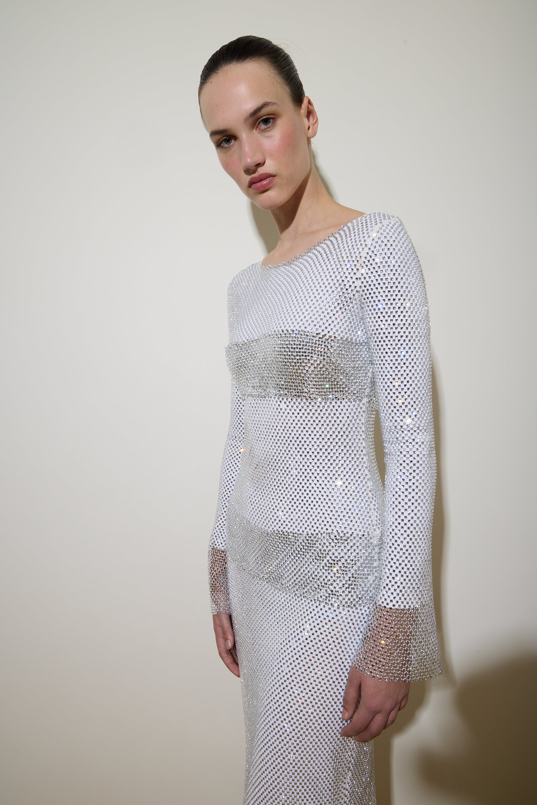 The design consists of two pieces: a minimalist ivory-toned base and a completely sheer overdress, crafted from a crystal mesh that provides a dazzling texture and a sculptural effect. The closed neckline and long sleeves balance the sensuality of the fabric, lending a serene and modern elegance.