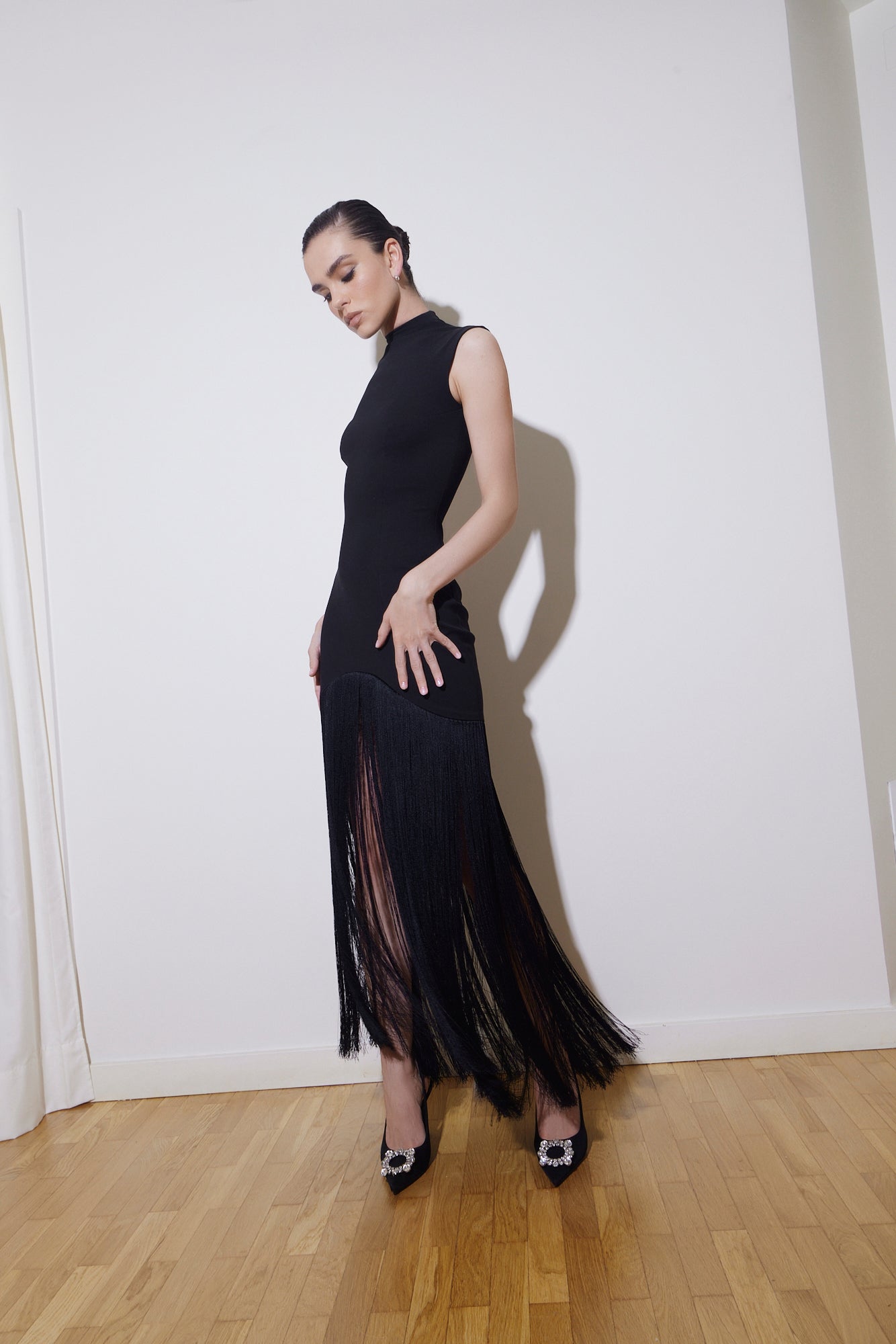 Los flecos deluxe efecto seda de la falda añaden dinamismo y brillo en cada paso, creando un efecto visual lleno de glamour